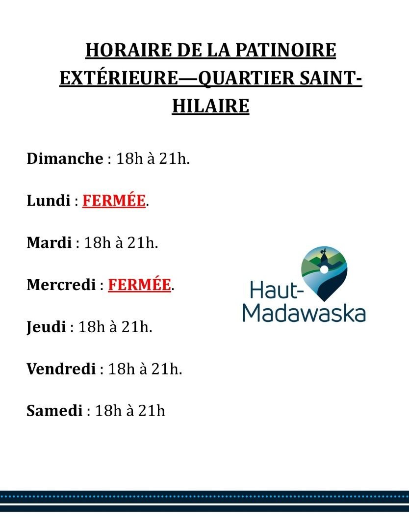 Voici l'horaire de la patinoire extérieure - Quartier Saint-Hilaire :