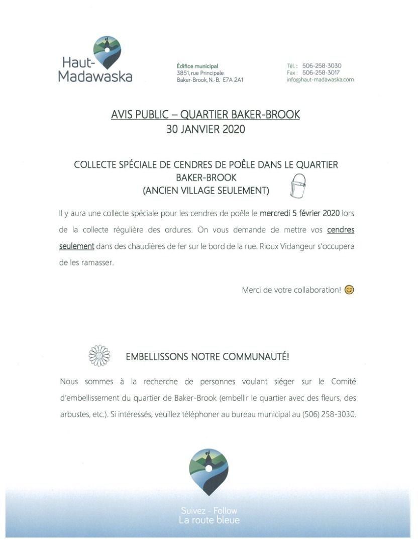 Il y aura une collecte spéciale pour les cendres de poêle le mercredi 5 février 2020 lors de la collecte régulière des ordures. On vous demande de mettre vos cendres seulement dans des chaudières de fer sur le bord de la rue. Rioux Vidangeur s’occupera de les ramasser.