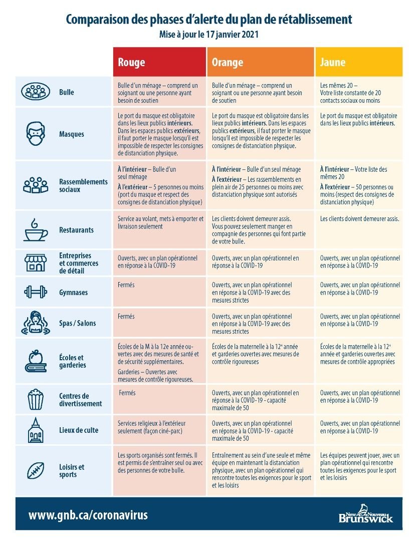 Le Gouvernement du Nouveau-Brunswick a annoncé aujourd’hui lors de sa conférence de presse que la zone 4, zone dans laquelle nous faisons partie, régressait dès minuit ce soir à la phase rouge du plan de rétablissement de la COVID-19.
