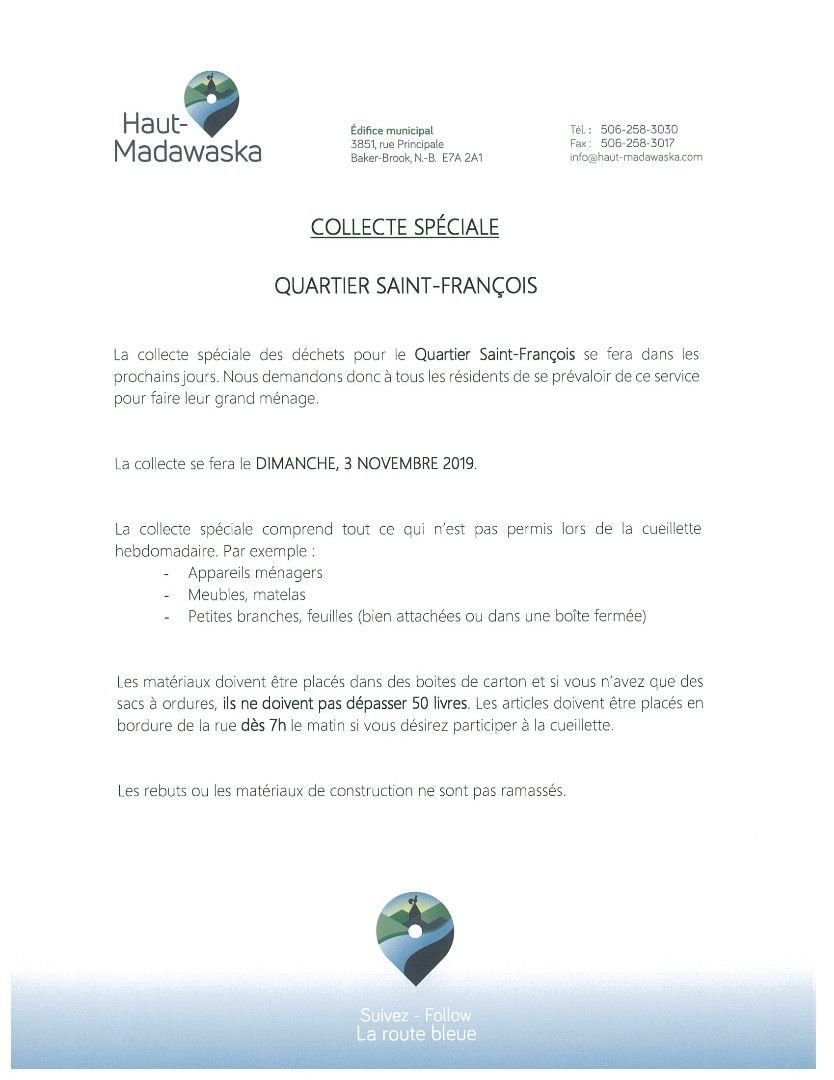 La collecte spéciale des déchets pour le Quartier Saint-François se fera dans les prochains jours. Nous demandons donc à tous les résidents de se prévaloir de ce service pour faire leur grand ménage.