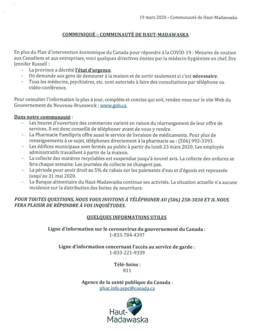 -La Banque alimentaire du Haut-Madawaska continue ses activités. La situation actuelle n’a aucune incidence sur la distribution des boites de nourriture.