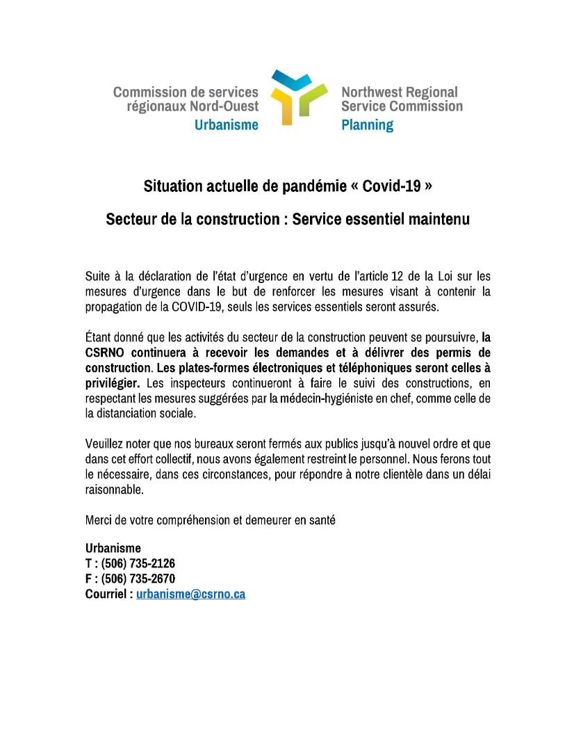Voici un communiqué de la part de la CSRNO - Commission de services régionaux Nord-Ouest concernant les permis de construction pendant la COVID-19.