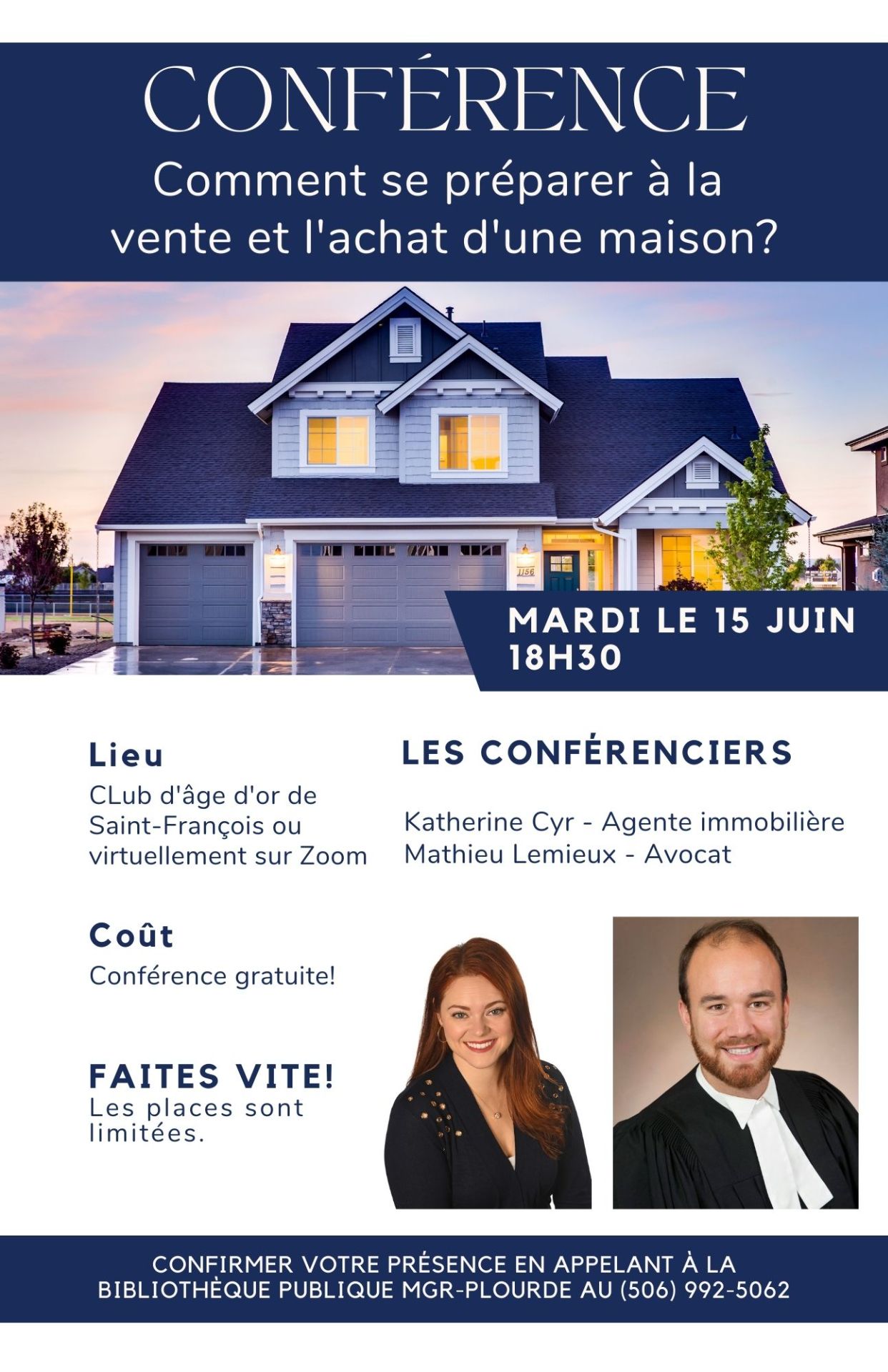 Il y aura une présentation le mardi 15 juin à 18h30 sur l’achat et la vente de maison. Une agente immobilière et un avocat seront présents pour répondre à vos questions. La présentation sera disponible en présentiel au Club d’âge d’or de Saint-François ou sur la plateforme ZOOM.