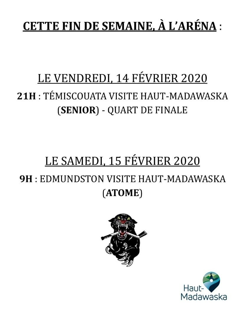 Voici l'horaire des activités se déroulant à l'Aréna J. Docithe-Nadeau, Quartier Saint-François cette fin de semaine.