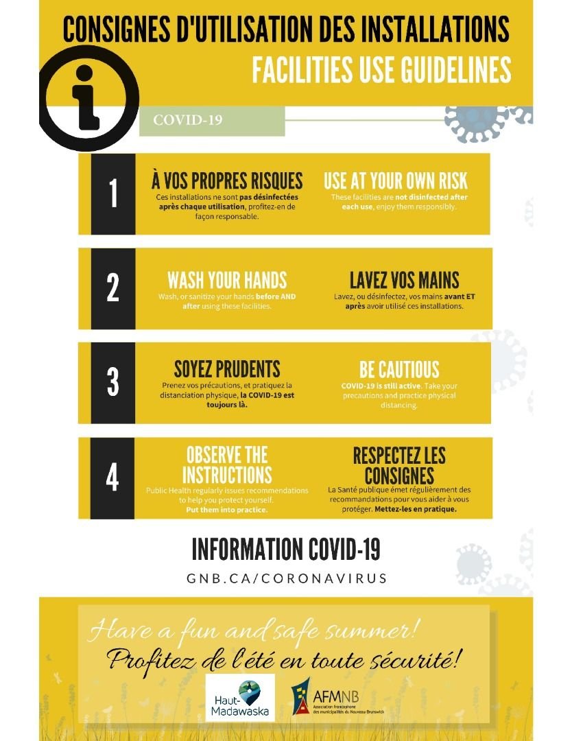 Bonne nouvelle! Certaines activités sportives ont repris au Complexe multifonctionnel - Quartier Clair. Si vous voyez l'enseigne ci-dessous, ceci veut dire que les installations ne sont pas désinfectées après chaque utilisation. Vous les utilisez donc à vos propres risques.
