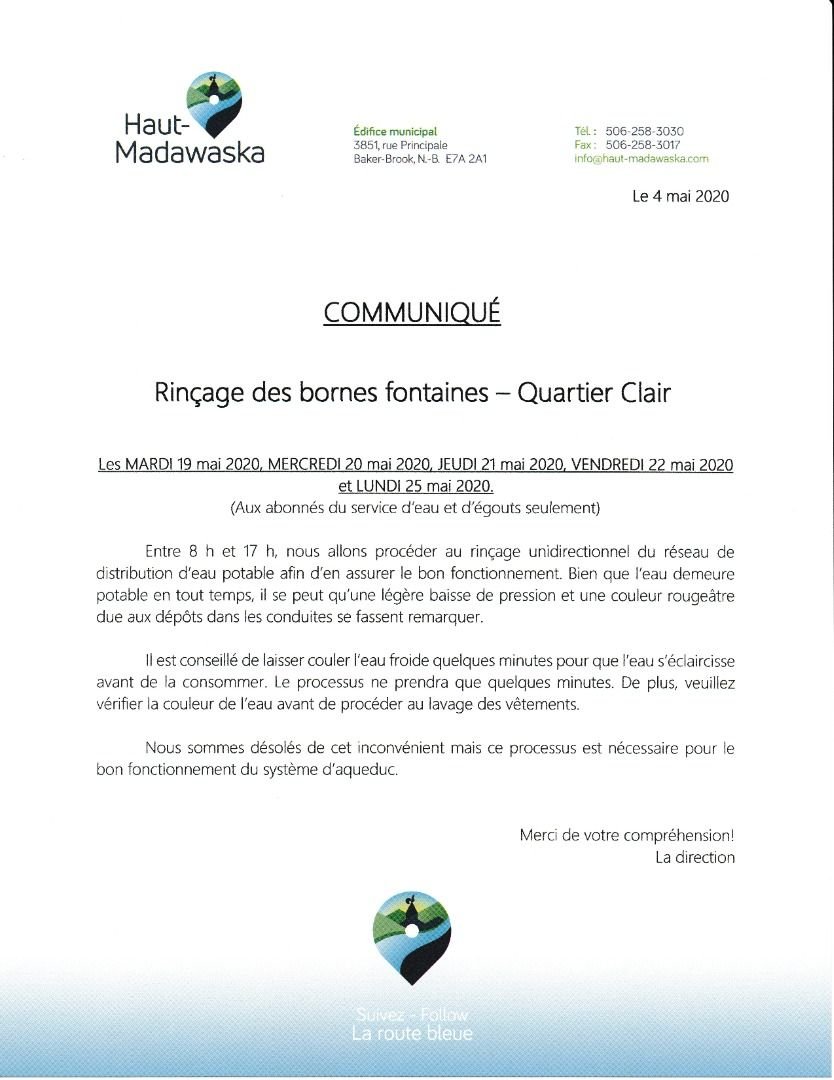 Entre 8 h et 17 h, nous allons procéder au rinçage unidirectionnel du réseau de distribution d’eau potable afin d’en assurer le bon fonctionnement. Bien que l’eau demeure potable en tout temps, il se peut qu’une légère baisse de pression et une couleur rougeâtre due aux dépôts dans les conduites se fassent remarquer.